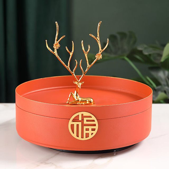 蒂拉 北欧客厅收纳带盖分格盘创意干果盘糖果盒旋转铁艺盒瓜子零食盘 H11959橙色多功能干果盘
