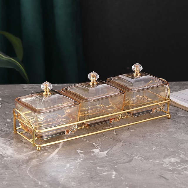 蒂拉 轻奢水果盘玻璃分格小吃盘糖果盒家用客厅茶几酒吧ktv零食干果碟 琥珀玻璃果碟3个(带盖)+3格金属托盘