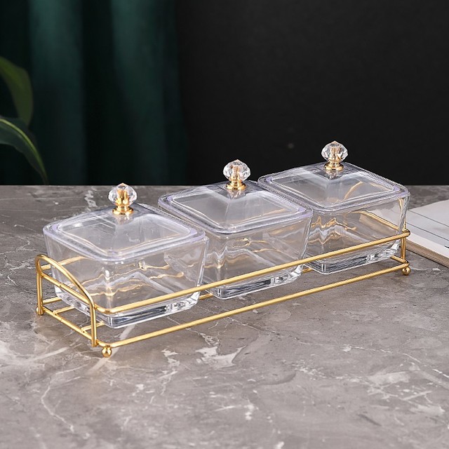 蒂拉 轻奢水果盘玻璃分格小吃盘糖果盒家用客厅茶几酒吧ktv零食干果碟 透明玻璃果碟3个(带盖)+3格金属托盘