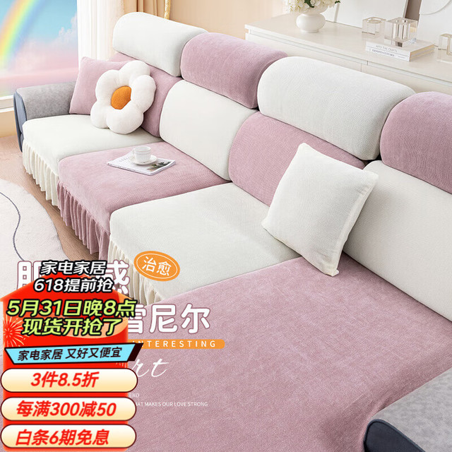 yibei 艺被 沙发套罩全包四季通用防猫抓简约裙边雪尼尔弹力沙发保护 雪尼尔裙边-少女粉 加大双