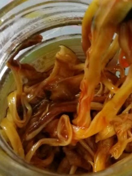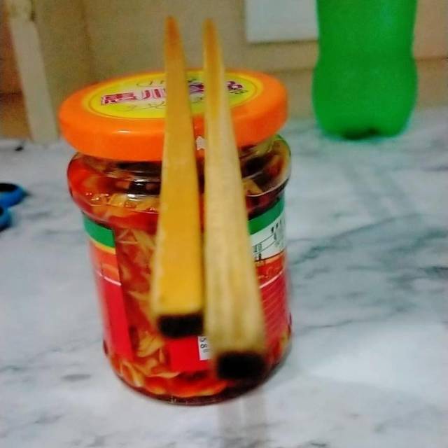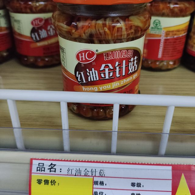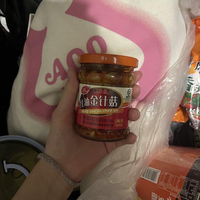满满一大瓶的金针菇酱,拌饭吃简直一绝,加点白米饭,或者小面条,超级棒!金针菇沁满了红油,但同时又保留了爽脆的口感,十几块钱两罐的快乐这不就来了吗